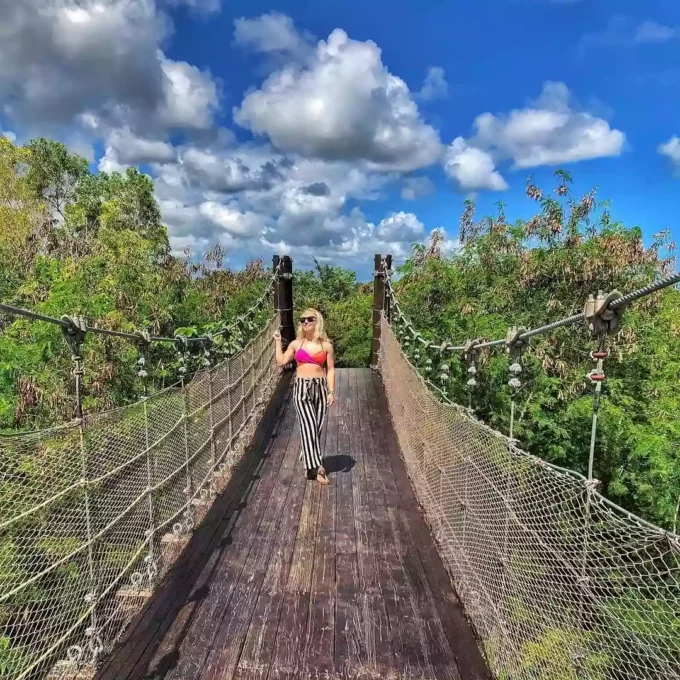Tirolesa: El recorrido incluye ocho emocionantes tirolesas, la más larga con una longitud de unos 457 metros y la más alta con una altura de 76 metros sobre los bosques de Cap Cana. Para llegar a cada plataforma, cruzarás puentes colgantes y senderos ecológicos con paisajes perfectos para fotografiar en cada curva.