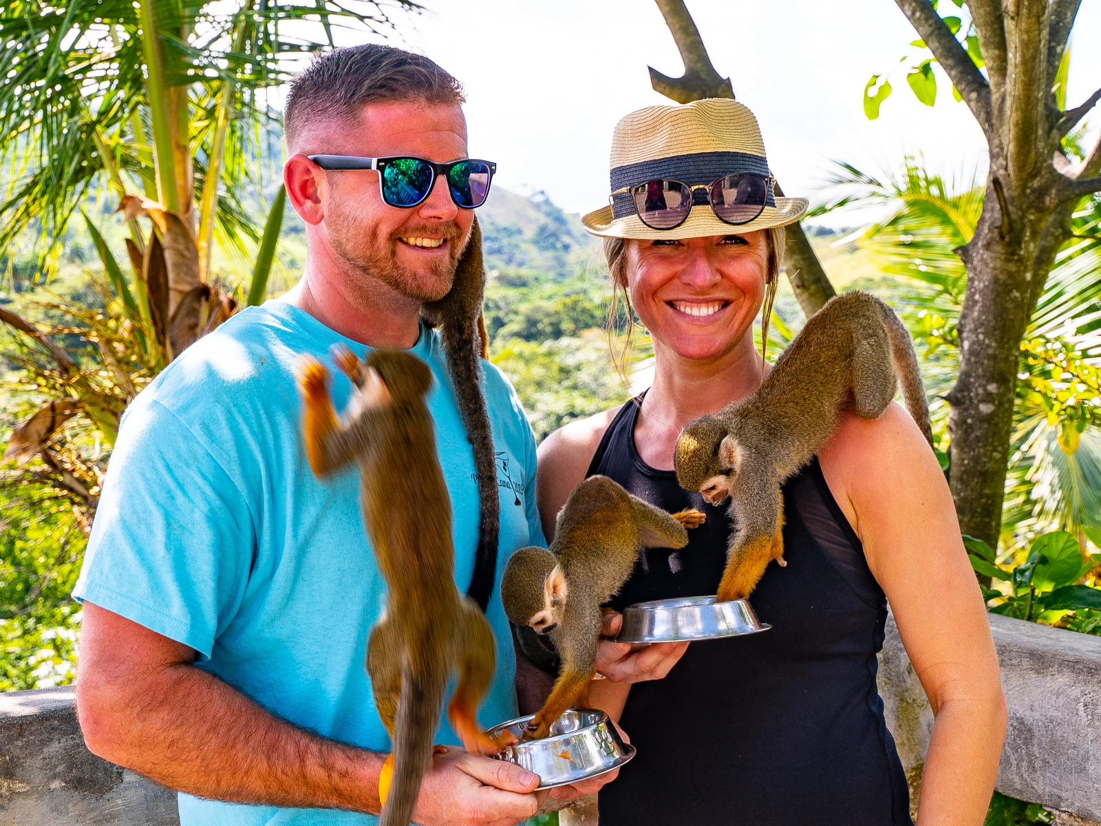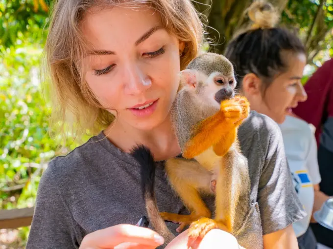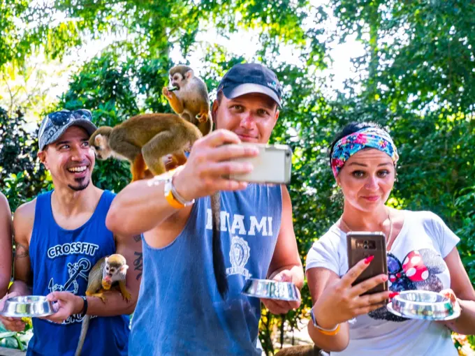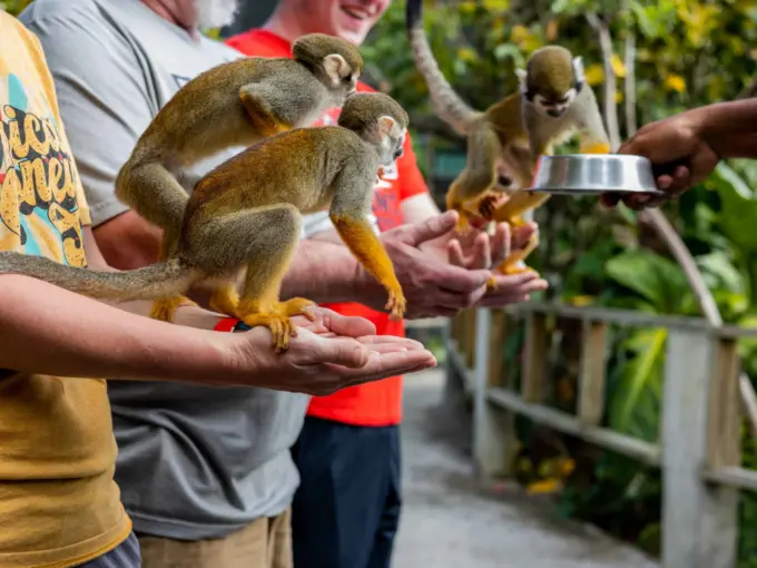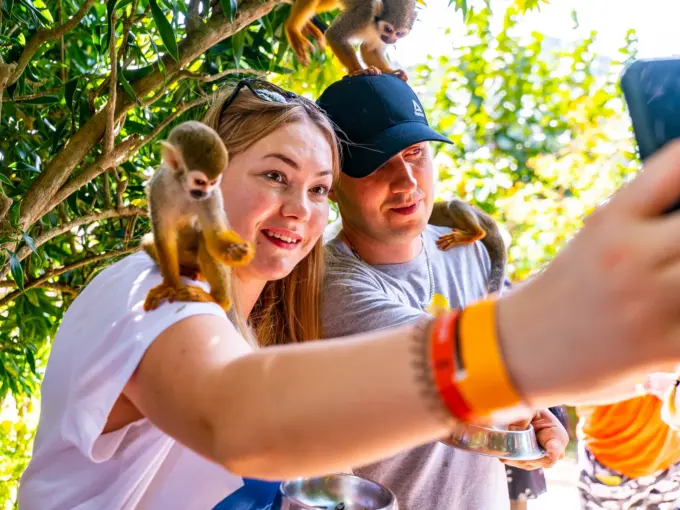 Los monos, que viven en un entorno natural y abierto, son increíblemente mansos. Disfrutan columpiándose desde los árboles para sentarse en uno o dos hombros desprevenidos, ¡siempre con la esperanza de encontrar algo que mordisquear en la palma de tu mano!